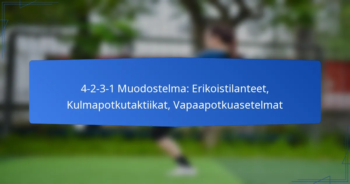 4-2-3-1 -muotoilu on suosittu taktinen asettelu jalkapallossa, joka korostaa sekä hyökkäyksen sujuvuutta että puolustuksen vakautta. Se koostuu neljästä puolustajasta, kahdesta keskikenttäpelaajasta, kolmesta hyökkäävästä keskikenttäpelaajasta ja yhdestä hyökkääjästä, mikä mahdollistaa joukkueiden tehokkaan siirtymisen hyökkäyksestä puolustukseen.